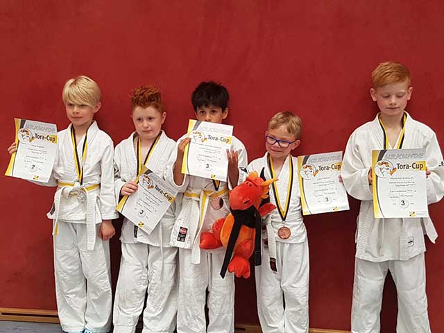 Am 28.05.2016 war es mal wieder soweit und wir fuhren mit sechs Kämpfern zum Tora-Cup nach Nienhagen. Für viele Kinder war es deren erstes Turnier und damit die Aufregung am Anfang ziemlich groß. Aber mit jedem Kampf wurde die Aufregung kleiner. Den Anfang machte Alicia, die als einziges Mädchen von unserem Verein dabei war und in der U10 bis 26,1kg kämpfte. Sie erwischte einen starken Pool, da sie aber von Kampf zu Kampf besser wurde sicherte sie sich den verdienten 3. Platz. Auch die Jungs in der U10 Maximilian George, Luca, Maximilian und Alper holten sich jeweils den 3. Platz. Dabei musste Maximilian in der Gewichtsklasse bis 30,8kg sogar zweimal in die Verlängerung, wodurch sein Kampf 4 statt 2 Minuten ging und somit deutlich anstrengender war. Trotzdem konnte er einen Kampf als Unentschieden nach Hause bringen und einen in den letzten Sekunden gewinnen. Maximilian George hingegen hatte es in der Gewichtsklasse bis 37,8kg am Schwierigsten, da er der deutlich kleinste und jüngste in seiner Gewichtsklasse war. Trotzdem hielt er super dagegen und machte es seinen meist zwei oder drei Jahre älteren Gegnern, die dementsprechend auch höher graduiert waren, nicht leicht. Luca in der Gewichtsklasse bis 21,7kg hatte erst zwei starke Gegner gegen die er sich super zur Wehr setzte aber letzten endlich kaum Punkte holen konnte. Dafür gewann er seinen letzten Kampf kampflos, sodass ihm der 3. Platz nicht zu nehmen war. Jonas hatte seine ersten beiden Kämpfe in der Gewichtsklasse bis 27,2kg souverän gewonnen, in seinem letzten Kampf verließen ihn dann aber in der Verlängerung die Kräfte wodurch er ganz knapp verloren hat. Dadurch war der Traum von Gold leider vorbei, aber Silber war ihm sicher und das hat er sich auch mehr als verdient.
