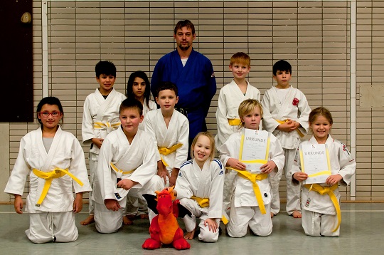 10 Kinder bestehen ihre Judoprüfung, sodass wir nun 6 neue Gelbgurtträger, 2 Gelb-orangegurtträger und 2 Weiß-gelb-Gurtträger haben.