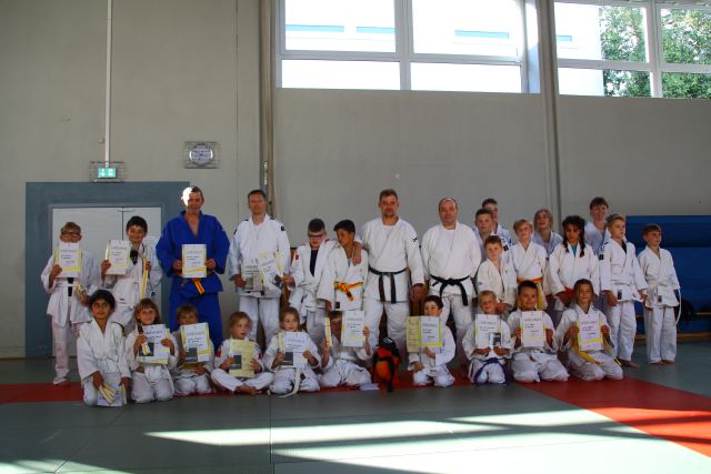 Am Freitag war unsere diesjährige Judoprüfung. Dabei zeigten unsere Judoka ihr Prüfungsprogramm, bestehend aus der Fallschule, mehreren Standtechniken und Bodentechniken mit Befreiungen. So bestand der älteste Teilnehmer der Prüfung, nämlich unser Spartenleiter Harald Langner seine gelb-orange Gürtelprüfung. Außerdem gab es noch eine weitere gelb-orange Prüfung und eine erfolgreiche gelb-Gurtprüfung. Dann gab es auch noch zwölf weiß-gelb-Gürtelprüfungen. Ganz besonders muss man dabei Talia erwähnen, da sie eine besondere Prüfung, extra für Judoka mit Handicap gezeigt hat. Diese Prüfung wurde extra für sie von unseren Trainern ausgearbeitet und lag weit über dem geforderten Maß.