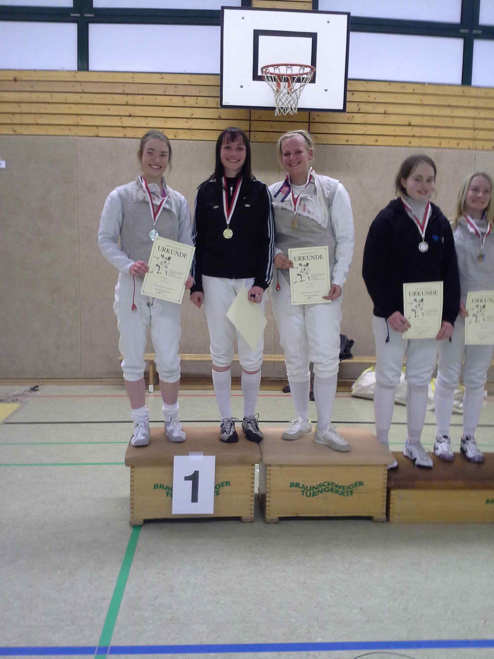 Völlig überraschend holten Marlen Grebehem, Ronja Läger und Lisa Holste bei den Landesmannschaftsmeisterschaften in Braunschweig den Titel. Im Finale besiegten sie die Fechterinnen von Frisia Wilhelmshaven nach einer starken Leistung deutlich mit 45:24. Für Marlen und Ronja war es nach langer Wettkampfpause der erste Wettkampf seit Jahren. Sie zeigten aber deutlich, dass sie nichts verlernt haben und wiesen ihre Gegnerinnen in die Schranken. „Unser großer Vorteil war, dass wir uns nur auf den Mannschaftskampf konzentriert haben und nicht zusätzlich im Einzel an den Start gegangen sind.“, verriet Mannschaftskapitän Marlen Grebehem das Erfolgsgeheimnis. „Ansonsten wäre der Kampf womöglich ganz anders verlaufen“.