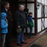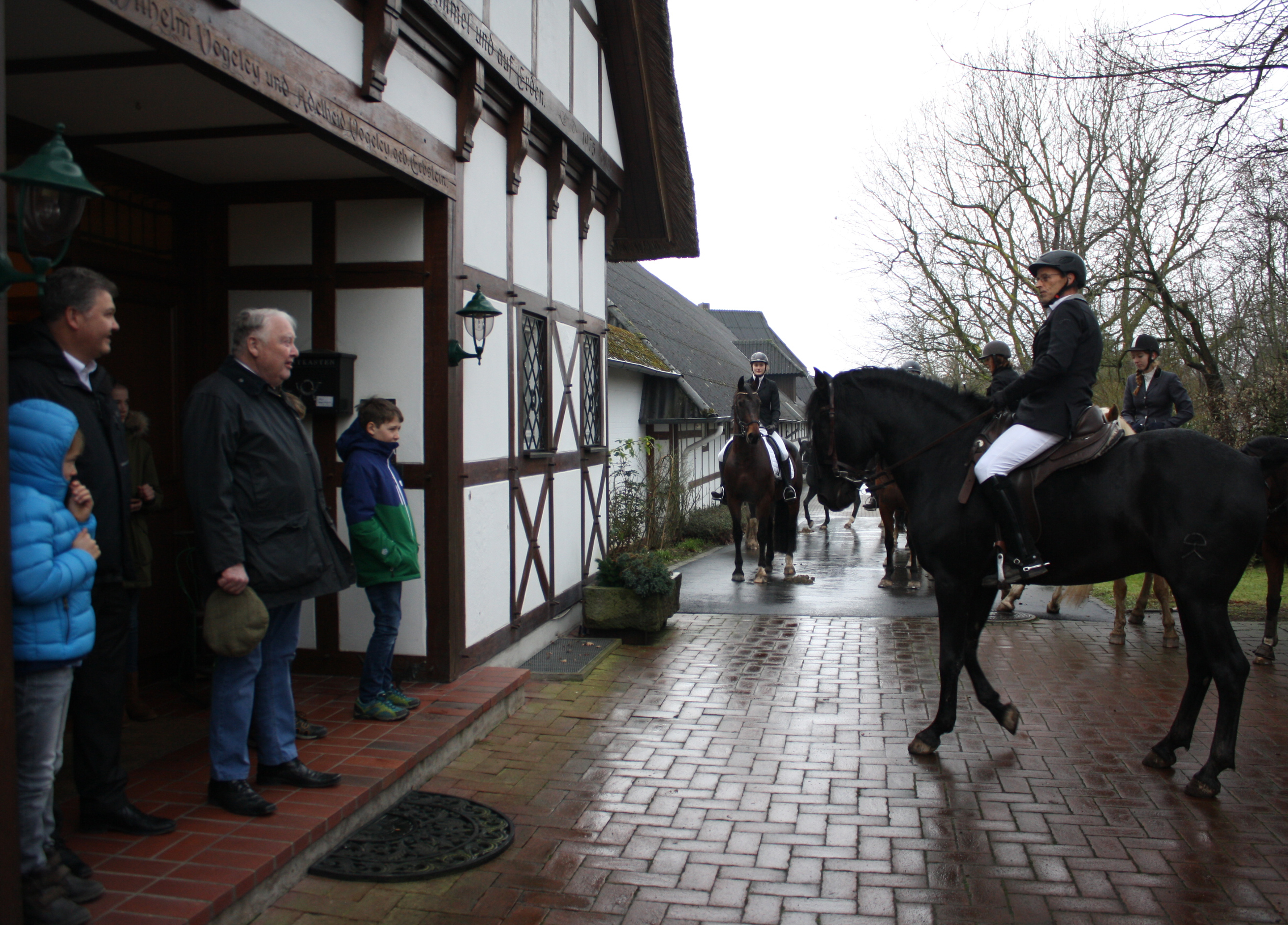 Auf dem Foto (für Vergrößerung klicken) gratuliert der aktuelle Vorsitzende des Hamelner Reitervereins von 1925, Holger Mai, dem Ehrenvorsitzenden Hans-Wilhelm Vogeley zum 80. Geburtstag. Trotz eisiger Temperaturen und Regenschauern ist eine Abordnung von 15 Pferden und Reitern im Turnierdress zu diesem Zweck nach Hastenbeck geritten. > Quelle
