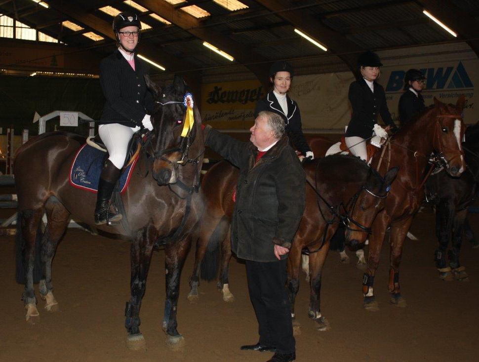 Am Sonntag fand das traditionelle Neujahrsspringen statt. Bei der Siegerehrung überreicht Hans-Wilhelm Vogeley (1. Vorsitzender) den Siegerpokal an die Gewinnerin Marie Grund mit Donna Fee. Daneben die Platzierten Corinna Bock auf Hells Angel, Greta Menke auf Kosimo und Melina Böttcher auf Championesse