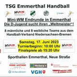 TSG Emmerthal von 1910 e.V. - HandballAm Samstag und Sonntag, 3. und 4. Juni, wurde an acht Standorten die Hauptrunde der Mini-Weltmeisterschaft ausgetragen. 16 D-Jugend-Teams, je acht weibliche und männlich bzw. gemischte, haben sich für das Finalturnier des Handballverbandes Niedersachsen-Bremen e.V. (HVNB) am Samstag, 17. Juni, in Emmerthal qualifiziert.