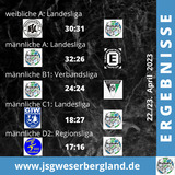 JSG Weserbergland - HandballDie weibliche A und männliche C1 feiern in der Landesliga jeweils Auswärtssiege. Die männliche A schlägt im letzten Saisonspiel den TuS Empelde deutlich. An den Rand einer Niederlage brachte die männliche B1 Spitzenreiter Burgdorf 2, muss mit dem Abpfiff aber noch den Ausgleich hinnehmen. Eine knappe Niederlage muss die männliche D2 bei der HSG Laatzen-Rethen einstecken.