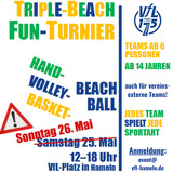 Am Sonntag, 26. Mai, findet das TRIPLE-BEACH-FUN-Turnier des VfL Hameln statt. Die Mannschaften (Mixed-Teams möglich!) treten abwechselnd in den Sportarten Beach-Volleyball, -Basketball und -Handball gegeneinander an, wobei der Spaß absolut im Vordergrund stehen wird!