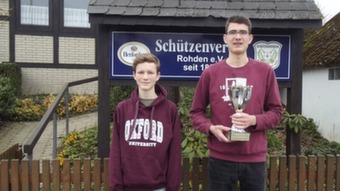 Zum neunzehnten Male wurde der vereinsinterne Rohdener Mammutpokal mit dem Luftgewehr ausgeschossen. Bisher konnten sich sechs Teilnehmer auf dem Pokal eintragen. Die bisherigen Sieger waren: Bianca Glinke, Tanja Buchmeier, Dominik-Alexander Herbst je 5-mal, sowie je 1-mal Lea Wichmann, Uwe Hoff, Lisa Fresdorf. In diesem Jahr kommt ein neuer Name hinzu. Im Bruderwettstreit setzte sich Lukas Veselý (Foto rechts) mit 912 Ringen ggü. seinem Bruder Jakub (873 Ringe) (Foto links) durch. Nach diesem 100-Schuss-Programm waren beide sichtlich gezeichnet, aber sehr zufrieden mit ihren Ergebnissen.