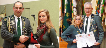 Foto links: Bianca Glinke bei der Ehrung zur Schützin des Jahres 2012 durch den Kreissportleiter Thomas Bräuer (Aufnahme: Ilona Harthun), Foto rechts: Petra Römmer und Joachim Meyer mit der Auszeichnung für ihre Verdienste um das Schützenwesen (Aufnahme: Klaus Römmer)