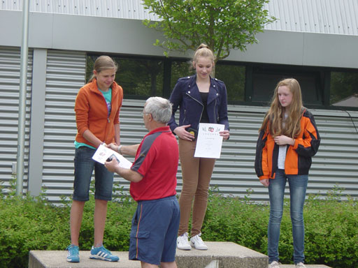 Das Foto zeigt Lea Wichmann bei der Überreichung der Silbermedaille durch den Landestrainer Norbert Poltermann