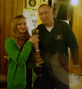 Aber auch unsere Küche war nicht untätig und so zauberten unsere Damenleiterin Petra Römmer und ihre Stellvertreterin Melanie Meyer aus insgesamt 130 Eiern leckere "Stramme Mäxe" welche unter den anwesenden Gästen reißenden Absatz fanden. Aber auch 30 bunten Eier und unzählige schokoladene Genüsse fanden ihren Abnehmer. Wie in jedem Jahr wurden unter den Teilnehmern drei Preise verlost. So fanden ein saftiges, frische Fleischhähnchen sowie eine Flasche Eierlikör und “Hintenhoch” einen neuen Besitzer. Unsere Schützenschwester kämpfen nicht nur um die Ostereier, sondern auch um den Damenpokal, welcher Jährlich zur selben Zeit ausgeschossen wird. 14 Schützenschwestern traten hierzu an. Gänzlich knapp fiel dann das Ergebnis aus, als zur Siegerehrung gerufen wurde. Den dritten Platz belegte unsere Juniorin Jeanette Roy mit 94 Ring, den silbernen, zweiten Platz sicherte sich unsere Prinzessin Irina Hiddesen mit 95 Ring und wurde damit nur erdenklich knapp mit 96 Ring von Bianca Glinke (Foto mit Klaus Römmer bei der Siegerehrung), auf Platz Eins geschlagen. Alle Anwesenden lobten die gute Organisation, das leckere Essen und die gute Stimmung an diesem Abend. Der Vorstand hofft, auch im kommenden Jahr wieder so viele Mitglieder am Gründonnerstag begrüßen zu dürfen. (Bericht Klaus Römmer)