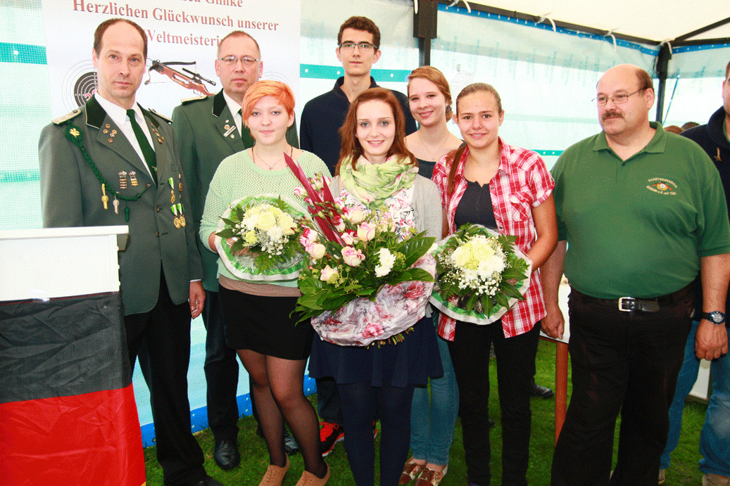 "Ich möchte diese Gelegenheit nutzen, um den Gästen auch die weiteren Teilnehmer an den Deutschen Meisterschaften vorzustellen" fuhr Römmer fort, "denn unser Schießsport findet leider oft etwas im Verborgenen statt." Insgesamt nahmen die Rohdener Junioren seit dem Jahr 2000 bereits neun Mal an den Deutschen Meisterschaften teil und konnten im Jahr 2014 insgesamt 6 Jugendliche und Junioren nach München entsenden, was für den kleinen Verein allein schon ein Rekord war. Erstmal konnten die Sportler- und Sportlerinnen nicht nur als Einzelschützen, sondern auch als Mannschaften dort antreten und waren mit insgesamt 16 Starts an den Meisterschaften vertreten. Den 15. jährigen Lukas Vesely bat Römmer, als einzigen männlicher Jugendlichen, zu sich, um ihn der Runde vorzustellen. Als Jüngste im Bunde bat Römmer die 14. jährige Nina Kruse zu sich. Als einzige Rohdenerin hieß der Vorsitzende die 16. jährige Lea Wichmann in der Runde willkommen. 19 Jahre ist Kai-Viktoria Schirmag alt, die vom Schützenverein Ohr für die Rohdener Junioren nach München fuhr. Aus Stadthagen kommt die ebenfalls 19. jährige Jeanette Roy, die neben Bianca Glinke die zweite Rohdener Juniorin in der Deutschen Armbrust Nationalmannschaft ist und ebenfalls in München antrat. Last but not least begrüßte Römmer, unter großem Applaus der Gäste, endlich die 19. jährige Bianca Glinke als neue Weltmeisterin und seit kurzem auch als Deutsche Meisterin.