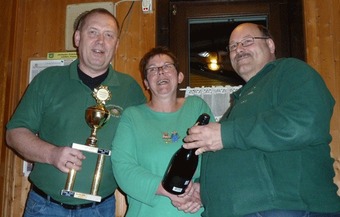 Auf Platz sieben bis neun kamen mit jeweils 55 Ringen Matthias Glinke, Rainer Rebeschke und Dominick Bruns. 56 Ringe reichten für Olaf Neitz und Angelika Stiebler zu Platz fünf und sechs. Die besten vier Schützen erzielten jeweils 57 Ringe. Bei Ringgleichheit gibt das KK-Ergebnis den Ausschlag. Mit jeweils 28 Ringe im KK gingen die Ränge zwei bis vier an Helge Hiddensen, Nina Kruse und Friedrich-Wilhelm Deidert. Die 29 Ringe im KK sorgten dann für den Sieg durch Klaus Römmer, der den Pokal erstmalig gewann. Jugendleiter Uwe Hoff überreichte dem Sieger dann den Pokal. Astrid Hücker vom Ortsrat erhielt, als beste Schützin des Ortsrates, eine Flasche Sekt. Mit 25 Ringe mit dem KK war sie sogar noch ein Ring besser als mit dem Luftgewehr. Anschließend wurden beim gemütlichen Teil des Abends, die Ergebnisse diskutiert. (Foto von links: Klaus Römmer, Astrid Hücker, Uwe Hoff)