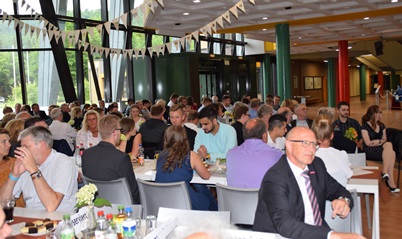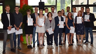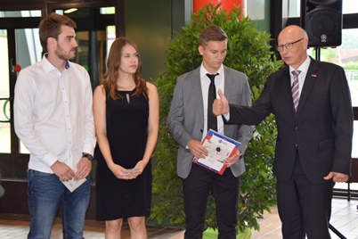Herr Steinmann, Vorsitzender des Fördervereins, konnte die Freude der Schüler/innen an diesem besonderen Abend gut nachempfinden, erinnerte er sich noch an seine eigene Abiturentlassung. Die Firmen suchen Fachkräfte und brauchen gut qualifizierte Jugendliche. „Streben Sie nicht nur nach Sicherheit, machen Sie sich selbstständig“, empfahl Herr Steinmann den Schüler/innen. Selbstständig zu sein bedeutet auch selbstbestimmt zu sein. An diesem Abend erhielt Herr Steinmann zusätzlich die freudige Aufgabe, die Jahrgangsbesten für ihre besonderen Leistungen auszuzeichnen. Die drei besten Abiturienten 2017 an der ERS sind Hanna Gregorius, David Kreiselmeier und Mike Labod. Herr Labod wurde darüber hinaus mit einem Buch und der Mitgliedschaft bei der Physikalischen Gesellschaft für seine besonderen Leistungen im Fach Physik geehrt.