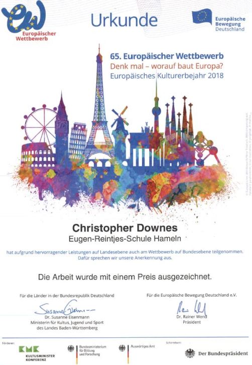 Schüler der Eugen-Reintjes-Schule gewinnt den 1. Platz beim Europäischen Wettbewerb