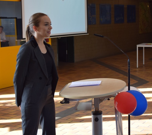 Die Schülersprecherin, Jovana Rippe, freute sich, so viele Schüler/innen zu sehen, die ihr Abitur geschafft haben. Nach Jahren des Fleißes, der Erfolge, aber auch einiger Niederlagen und manchmal auch mit Umwegen, haben sie nun ihr gemeinsames Ziel erreicht. Das Abitur ist das Ende der Schulzeit, aber der Anfang eines neuen Lebensabschnittes. „Vielleicht öffnet Ihr während diesen neuen Lebensabschnittes eine falsche Tür“, so Frau Rippe. Doch eine falsche Tür zu öffnen ist besser, als gar keine zu öffnen. Denn das schlimmste, sind unerfüllte Träume. Mit diesen Worten wünschte sie ihren ehemaligen Mitschülerinnen und Mitschülern alles Gute für ihre Zukunft.