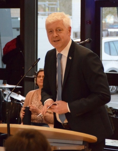 In seiner Rede gratulierte Gastgeber Johannes Stolle den Jugendlichen zu ihrem großen Erfolg. In seinen Ausführungen hob er an einem Beispiel des autonomen Fahrens von modernen Kraftfahrzeugen hervor, dass nicht nur die Technik vor dem Menschen, sondern auch der Mensch vor der Technik geschützt werden müsse. Da die derzeit autonom konzipierten Fahrzeuge noch eine Einheit aus Mensch und Maschine sind, sie aber autonom fahren sollen, müssen die Fahrzeuge menschlicher werden, um mit anderen Verkehrsteilnehmen kommunizieren zu können. Aus dem VUKA-Akronym griff sich der Schulleiter das "U" für Uncertainty (= Unsicherheit) heraus. An Beispielen verdeutlichte er, dass Unsicherheit auch einen positiven Charakter für Menschen hat, der uns, durch das Stellen von richtigen Fragen, die Möglichkeit bietet, sicherer und stabiler auf Probleme zu reagieren, die dann auch schneller zu Lösungen führen können. Mit einen Spruch von Victor Hugo "Die Zukunft hat viele Namen: für Schwache ist sie das Unerreichbare, für die Furchtsamen das Unbekannte und für die Mutigen die Chance." beendete er seinen Ausführungen mit dem Wunsch, dass die Jugendlichen immer ihre Chancen sehen und nutzen mögen.