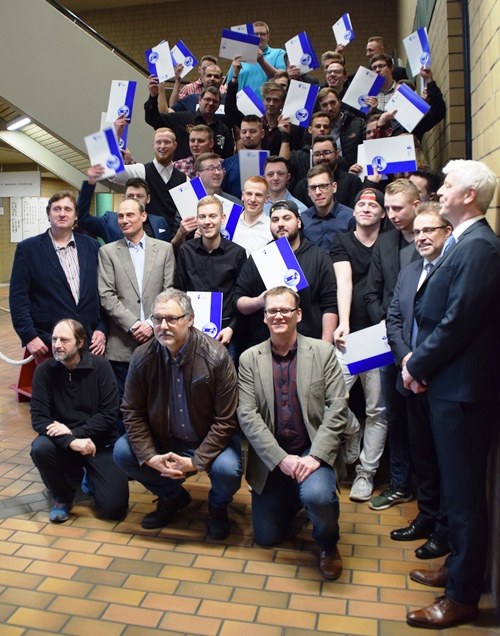 Die jungen Gesellen freuen sich mit ihren Lehrkräften, dem Obermeister und dem Lehrlingswart über ihren Erfolg.