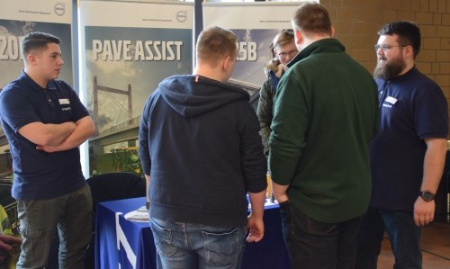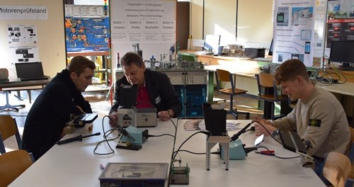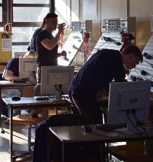 Setze man seinen Weg in den östlichen Teil des Gebäudes fort, gelangte am in den Bereich Automatisierungstechnik, Industrie/Wirtschaft 4.0 und zu den industriellen Elektrotechnik-Berufen. Hier war auch Fa. Lenze mit Auszubildenden präsent.
