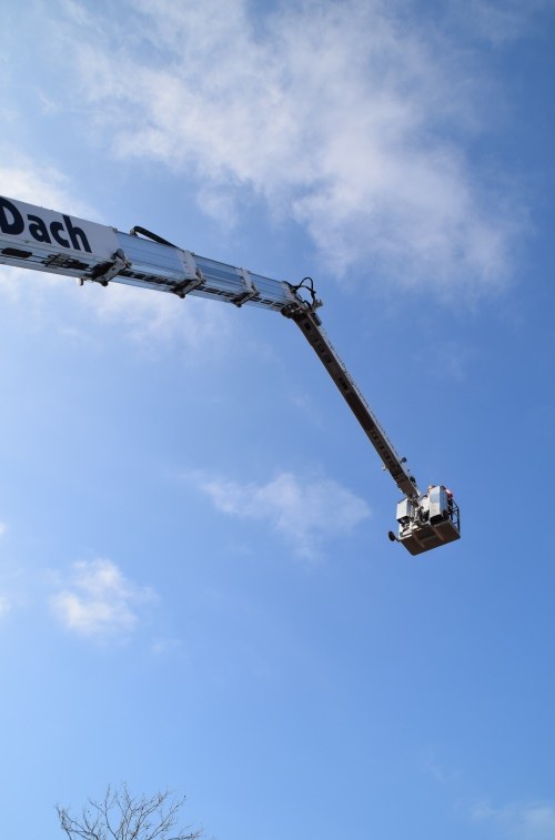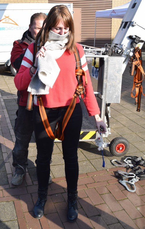 Vom Forum aus konnte man auf den Innenhof gehen. Dort begrüßte Sie das Dachdeckerhandwerk, aber auch der Jugendbeauftragte des Landesinnungsverbands. Kooperationspartner Junker Bedachungen bot eine luftige Fahrt in die Höhe an. Aus ca. 40 Metern konnte man die Umwelt von oben betrachten. Dazu waren vorher Sicherheitsmaßnahmen vorzunehmen.