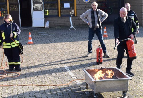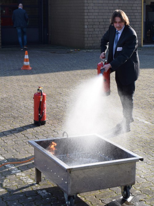 Bei dem wunderbaren Wetter kam man nicht daran vorbei, auf den KFZ-Hof zu gehen. Durch die Überlassung eines Feuerwehrfahrzeugs, die Idee, eine Truppmannausbildung für Schülerinnen und Schüler durchzuführen, wuchs die Ausstattung der Feuerwehrausrüstung - besonders durch die Unterstützung der Ortsfeuerwehren, der FTZ und durch Landkreis und Stadt - immens. Schulleiter Johannes Stolle musste sich im Löschen eines Feuers beweisen, ...