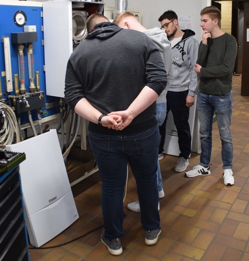 Auch bei den Anlagenmechanikern/innen zeigten die Besucher reges Interesse. Wie sieht es aus mit moderner Warmwassergewinnung? Wie funktioniert eine Entkalkungsanlage? Die anwesenden Auszubildenden begeisterten die Fragenden von dem Beruf im Bereich Klima, Kälte, Sanitär.