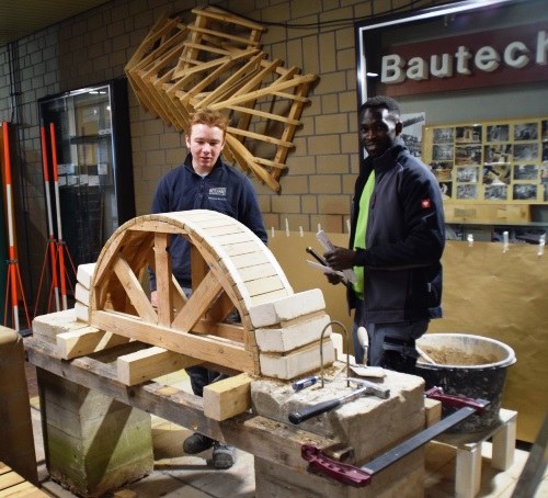 Zwei Jugendliche zeigen, wie man einen Sturz mit Lehre z. B. für ein Fenster mauert.
