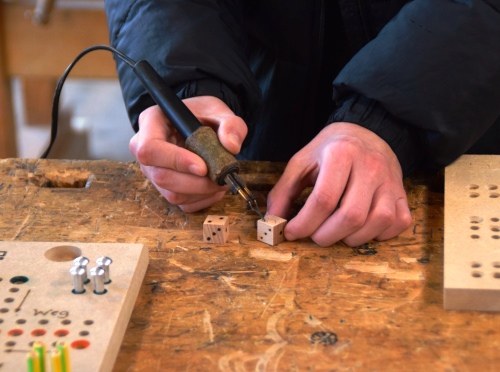 ... und wer sich an dem Erstellen des Spiels beteiligt hat, hat hier sein Spielbrett fräsen (lassen) und seinem Würfel 21 Brennpunkte verpassen können.