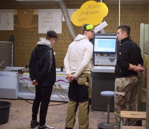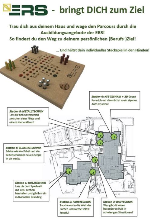Sehr gern fertigten viele junge Menschen das Steckspiel an. Dabei lernten Sie in einer Art Parkour verschiedene Berufsfelder (Metall-, Farb-, Bau-, Holz-, Elektrotechnik, 3D-Druck) kennen, in denen sie die Spielfiguren und das Spielbrett für das Steckspiel fertigen konnten. Gute Idee!