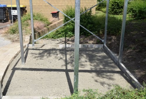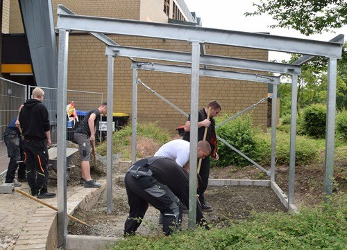 Die Brandlast, die durch die an der Außenwand des Gebäudes stehenden Müllgefäße entsand, musste beseitigt werden. Die finanzielle Lange des Landkreises ermöglichte keine schnelle Lösung. So boten sich die Teams aus der Metall- und Bautechnik an, gemeinsam an einem Entwurf mit Umsetzung für einen entsprechenden, ansehnlichen Unterstand zu arbeiten.