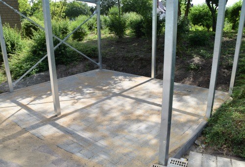 Nach Vorbereitung des Untergrunds, Rütteln, Schotter und Splitt einfüllen wurde die Fläche abgezogen und mit Pflaster belegt.