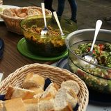 eine Bruschettta mit Avocado, Erbsen-Bohnen-Plätzchen mit Tomatenpesto und eine