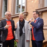 Schiller-Gymnasium Hameln - Allgemeinbildende SchulenAuf dem Schulfest im August im Bürgergarten wettete Schulleiter Jungnitz zusammen mit seinen Wettpaten Oberbürgermeister Claudio Griese und Kultusministerin Frauke Heiligenstadt, dass die Schulgemeinschaft es nicht schaffen würde, dass 1050 Menschen im Schiller-Shirt vor der Bühne gemeinsam „Ein Hoch auf uns“ singen würden.