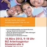 Schiller-Gymnasium Hameln - Allgemeinbildende SchulenEs gibt sie noch: freie Ausbildungsstellen für Sommer 2013! Junge Leute können auf der Ausbildungsstellenbörse am Donnerstag, den 14. März 2013 von 9.00 bis 18.00 Uhr im Berufsinformationszentrum der Arbeitsagentur, Süntelstraße 6 in Hameln ihre Chancen checken: