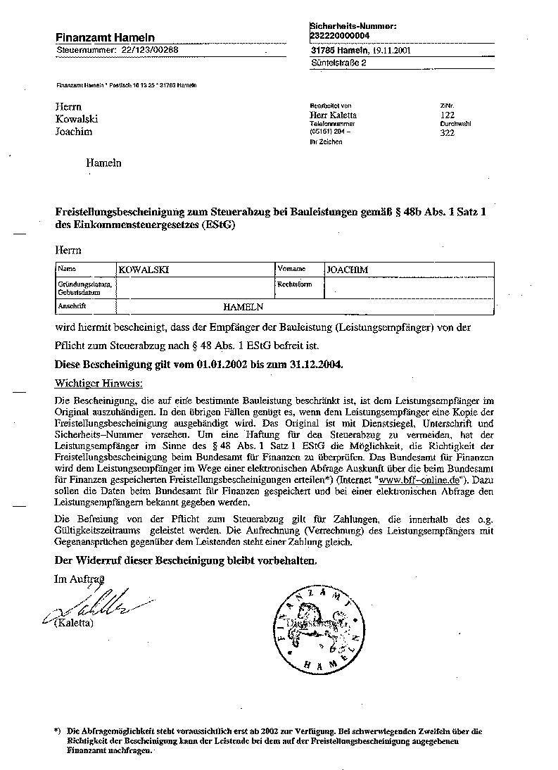 Die Firma Kowalski hat sich davon für Sie befreien lassen: Bei uns zahlen Sie keine Bauabzugssteuer!