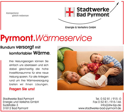 Mit dem Dienstleistungsangebot „Pyrmont.Wärmeservice“ übernehmen wir die komplette Verantwortung für eine neue Heizungsanlage, angefangen von der Planung über die Installation und Wartung einschließlich der Schornsteinfegerkosten. Für den privaten Vertragspartner bleiben ausschließlich eine über 15 Jahre fest kalkulierte monatliche Pauschale und selbstverständlich der Erdgaspreis für die Wärme zu zahlen. Da die installierten Anlagen dem modernsten Stand der Technik entsprechen, kann es zudem noch zu Energieeinsparungen bis zu 20 Prozent kommen.