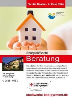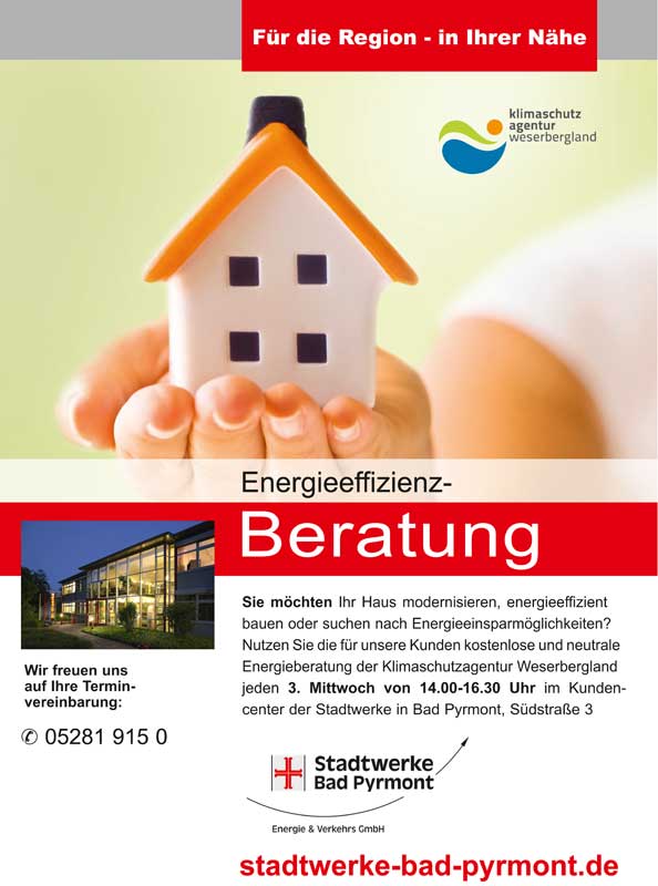 Die Klimaschutzagentur Weserbergland bietet in Bad Pyrmont jeden dritten Mittwoch im Monat kostenlose Beratungsgespräche zum Thema „Energetisches Bauen und Sanieren“ an.