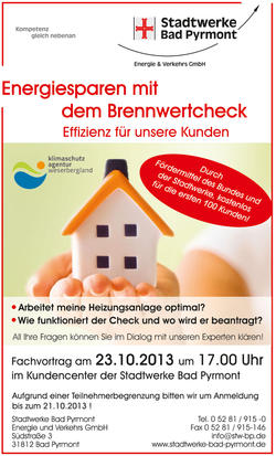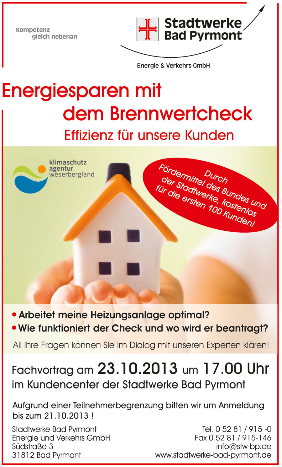 Im Rahmen unserer Energieeffizienzberatungstellen wir Ihnen gerne gemeinsam mit unserem Partner der Klimaschutzagentur Weserbergland vor, welche Vorteile Sie vom Brennwertcheck haben und welche Fördermittel die Stadtwerke für Ihre Kunden zur Verfügung stellen.