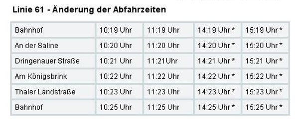Die Haltestellen An der Saline, Dringenauer Straße, Thaler Landstraße, Bahnhof der Linie 61 sind von den von der Stadt Bad Pyrmont angeordneten Verkehrsregelungen betroffen. „Unsere Busfahrer können den aktuellen Fahrplan durch die neue Verkehrssituation nicht mehr einhalten“, erklärt Dieter Boldt, Geschäftsführer der Stadtwerke Bad Pyrmont. Es ergeben sich folgende Abfahrtzeiten: