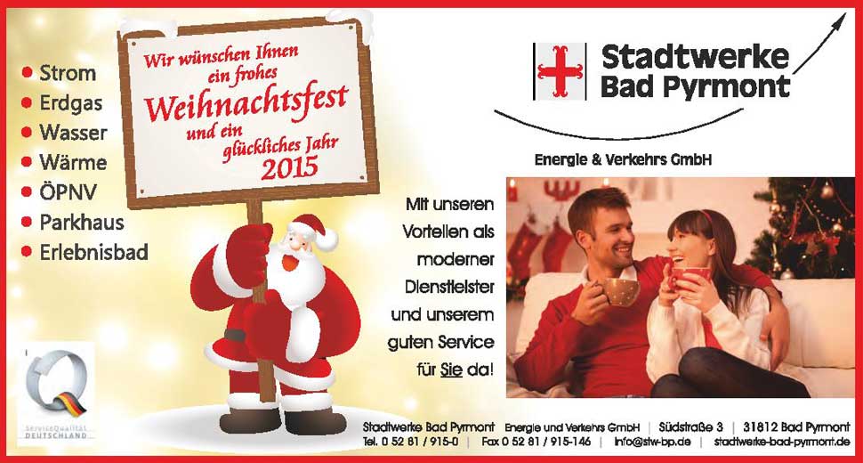 Verbunden mit den besten Wünschen für die restliche Adventszeit wünschen wir allen unseren Kunden ein frohes und besinnliches Weihnachtsfest und ein glückliches und zufriedenes Jahr 2015.