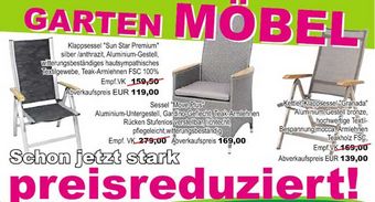 Von Gartenmöbel über Ampelschirme, Strandkörbe, Gartendekoration, Licht im Garten, Gartengeräte & Zubehör, Spiel & Sportgeräte, Grills - all das finden Sie in unserer Gartenmöbelausstellung.