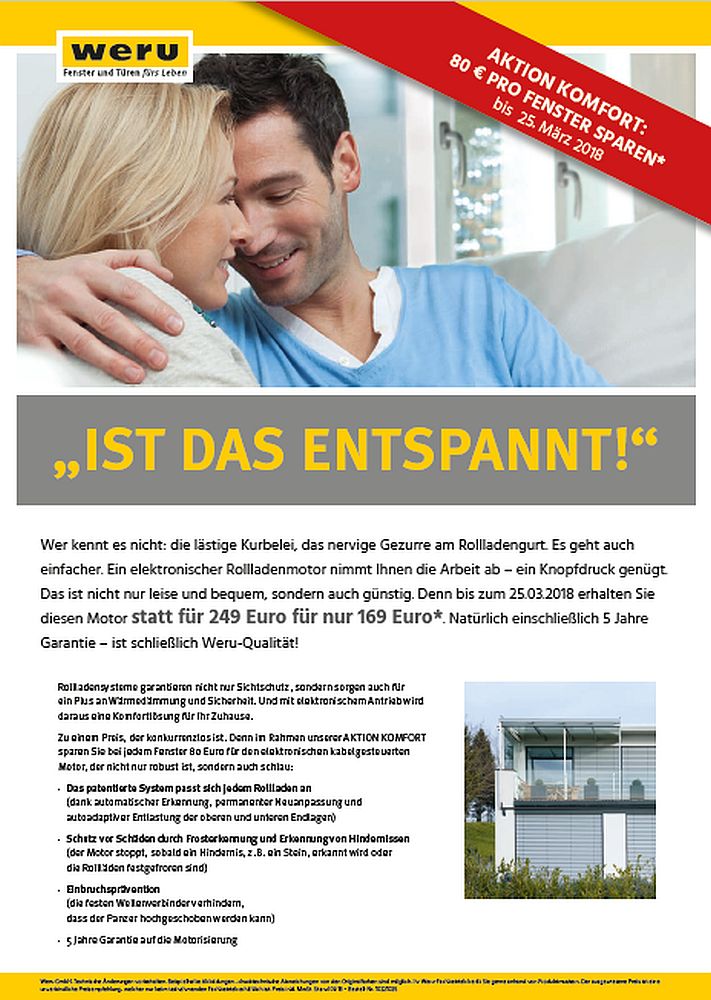 Das ist nicht nur leise und bequem, sondern auch günstig. Denn bis zum 25.03.2018 erhalten Sie diesen Motor statt für 249 Euro für nur 169 Euro*. Natürlich einschließlich 5 Jahre Garantie – ist schließlich Weru-Qualität!