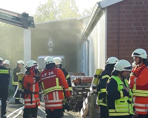 Einsatzabteilung - Die heutige Wehrübung fand bei der Firma Dieter Griese GmbH Bedachungen in Kirchohsen statt. Angenommene Lage war eine unklare Rauchentwicklung in einer Lagerhalle. Während der Lageerkundung stellte sich heraus, daß sich noch Personen in einer Lagerhalle befanden. Schnell wurden 3 Trupps unter Atemschutz zur Menschenrettung ins Gebäude geschickt. Parallel dazu bauten Kameraden die Wasserversorgung von einem nahe gelegegenen Bohrbrunnen auf. Im weiteren Verlauf wurde eine Person an einem Autokran aufgefunden, welche unter den Rädern eingeklemmt war. Dort kam die Besatzung des Rüstwagen (RW) zum Einsatz. Nachdem alle Personen gerettet wurden, konnte Übungsende gegeben werden.