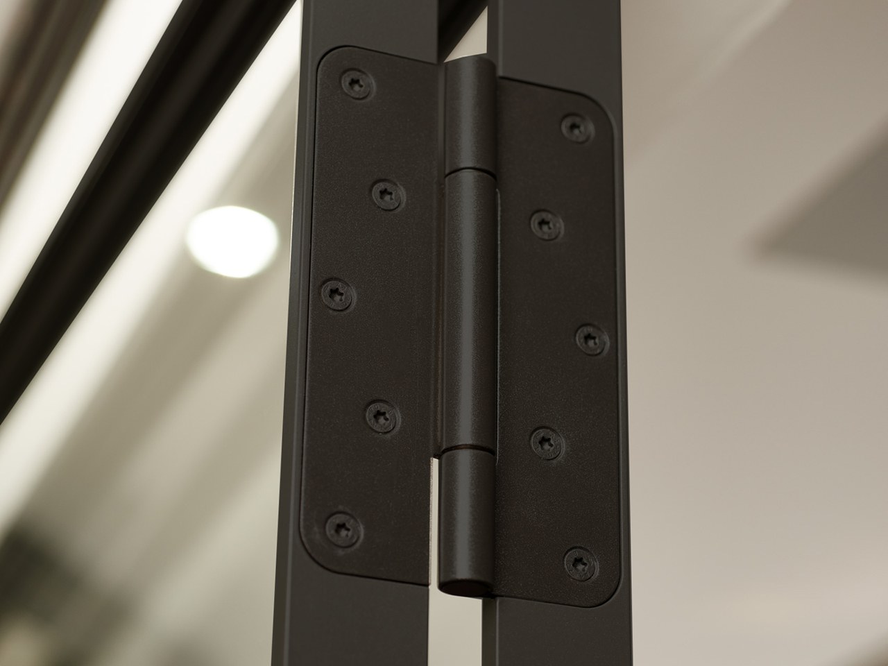 Die besteht aus gepulverten 40-mm-Flachstahlprofilen mit 8-mm-Glashalteleisten, schmalen Sprossen und 6-mm-Einscheiben-Sicherheitsglas.