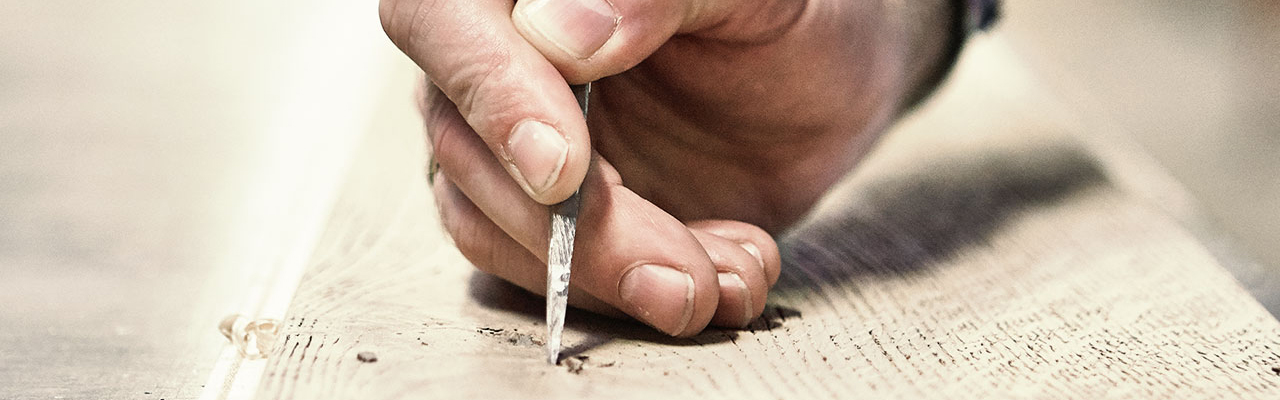 Die einzelnen Dielen der Unique Collection von Ter Hürne werden einzeln aus dem Holzrepertoire ausgesucht und für die Verarbeitung aussortiert. Dabei wird ein besonderes Augenmerk auf die charakteristischen Merkmale des Holzes gelegt. So werden explizit besonders interessante Maserungen und prägnante Akzente ausgewählt, um daraus die späteren Dielen zu fertigen. Diele für Diele wird anschließend von Hand bearbeitet.