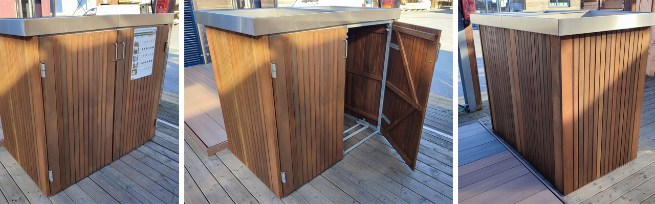 Das Müllbox-System von BINTO bietet viele verschiedene Verkleidungen und lässt sich nahezu beliebig Erweitern. Als Verkleidungsmaterial wird elegantes Edelstahl, streichfreies HPL, geöltes Hartholz und klassische Kiefer angeboten. Durch den modularen Aufbau lässt sich das System nahezu beliebig erweitern. Dabei ist es auch ohne Probleme möglich verschiedene Materialien miteinander zu kombinieren, so dass Sie sich Ihr individuelles Aussehen gestalten können. Als Abdeckung stehen entweder Klappdeckel oder Pflanzschalen aus Edelstahl zur Verfügung, die mit gängigem Füllmaterial und Pflanzen zur Dachbegrünung bestückt werden können. Die Deckel sind auch in den genannten Materialien zu haben und ebenso beliebig kombinierbar.
