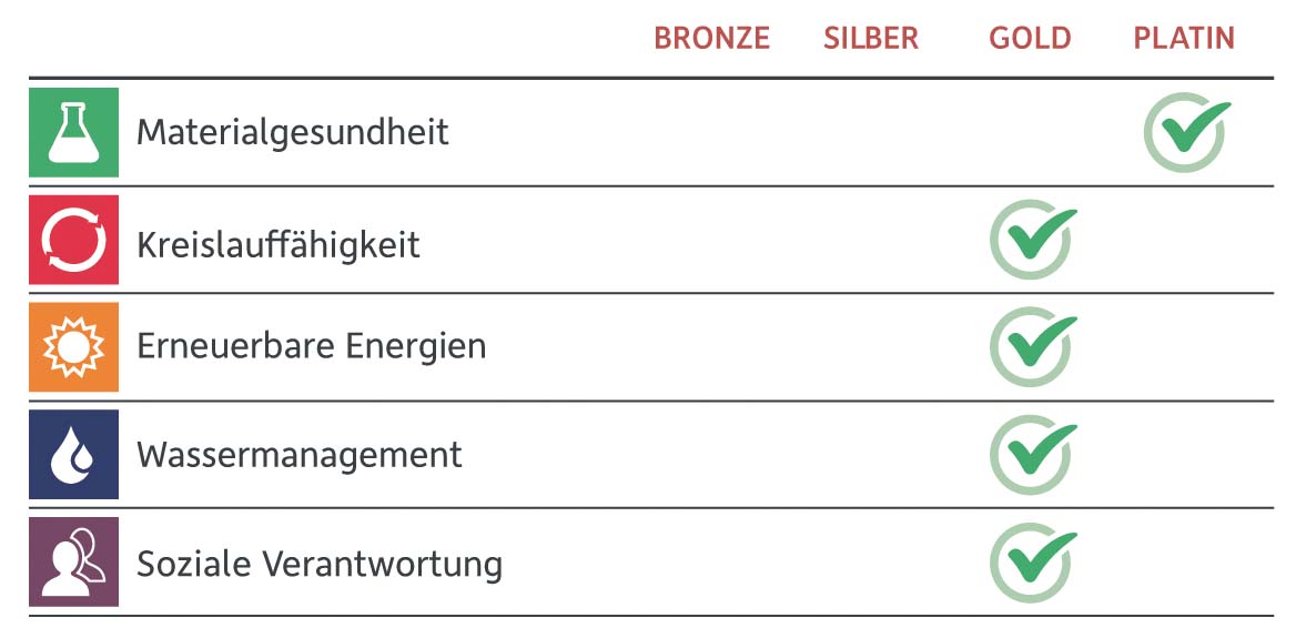 Bei der Zertifizierung wird außerdem berücksichtig, dass die verwendeten Rohstoffe und der verwendete Rohstoffkreislauf strengen Kriterien der human- und ökotoxikologischen Unbedenklichkeit unterliegen. Weiter wird großer Wert darauf gelegt, dass bei der Herstellung der Rohstoffe ein sinnvolles Wassermanagement und klimaneutrale Energiekonzepte zum Einsatz kommen. Hinzu kommen abschließend noch die die hohen sozialen Standards am Produktionsstandort in Deutschland.