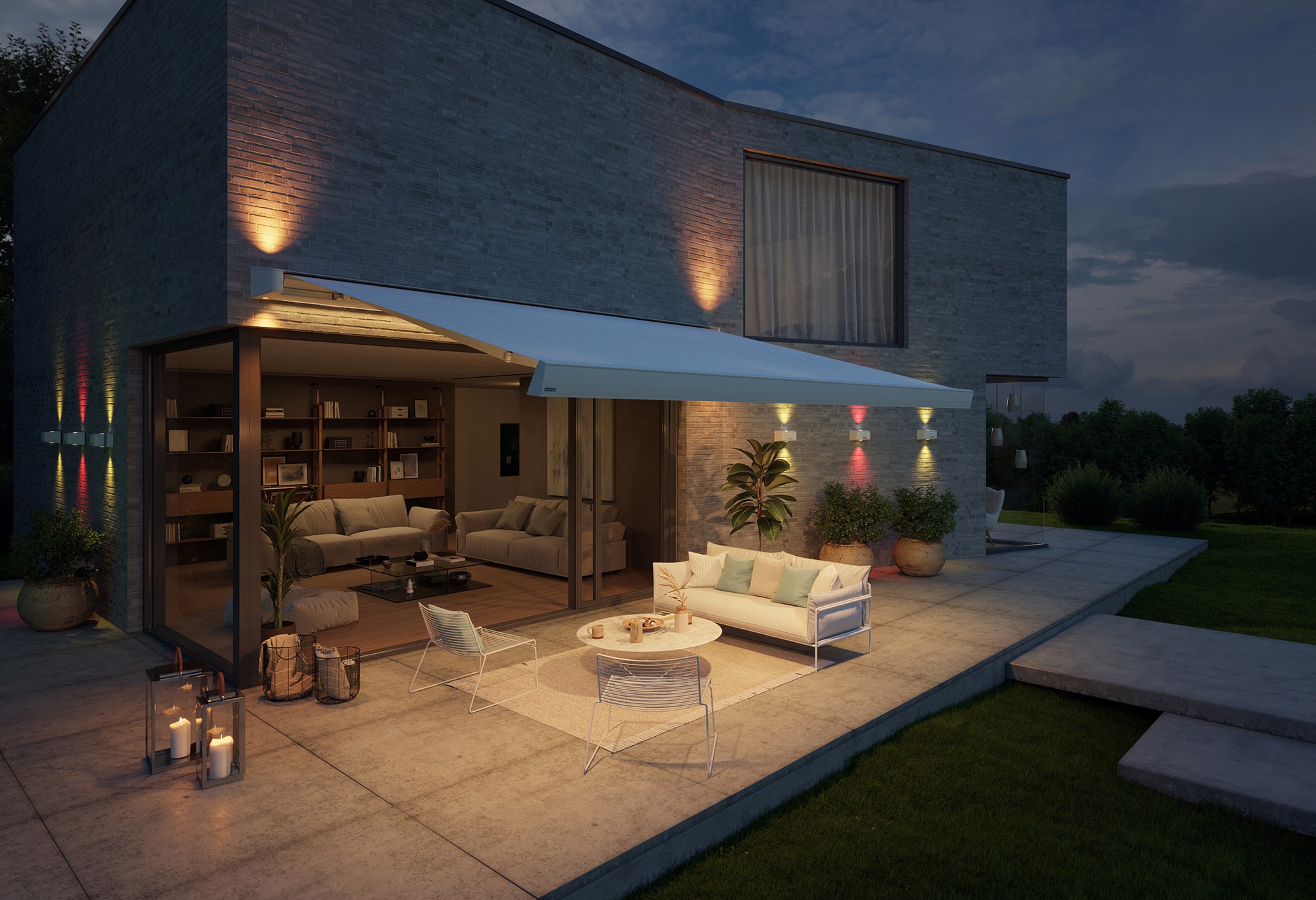 Schöne Atmosphäre zu jeder Jahreszeit bieten darüber hinaus moderne Lichtsysteme. Balkon, Terrasse oder Garten können auf diese Weise dezent beleuchtet werden. Punktuell durch LED-Spots oder durch effektvolle LED-Lines und Uplights. Das sorgt vor allem in den dunkleren Tagen für gemütliche Stimmung. Und zwar nicht nur draußen, sondern auch in den Innenräumen. Ein besonderes Highlight ist die Option, per App zwischen warmweißem und farbigem Licht wechseln zu können. Ganz nach Wunsch kann man sich dadurch schon auf den Sommer einstimmen oder Herbst und Winter mehr Farbe verleihen. So bieten die Markisen mit ihren Funktionen über den Sommer hinaus jede Menge Genusszeit im Freien. > Quelle