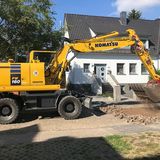 Koopmann & Wienkoop - Bauen und RenovierenDas Natursteinpflaster der Straße "Woge" in Hameln wird mit einem Sieblöffel aufgenommen, zwischengelagert und später in den Parkbuchten wieder eingebaut.