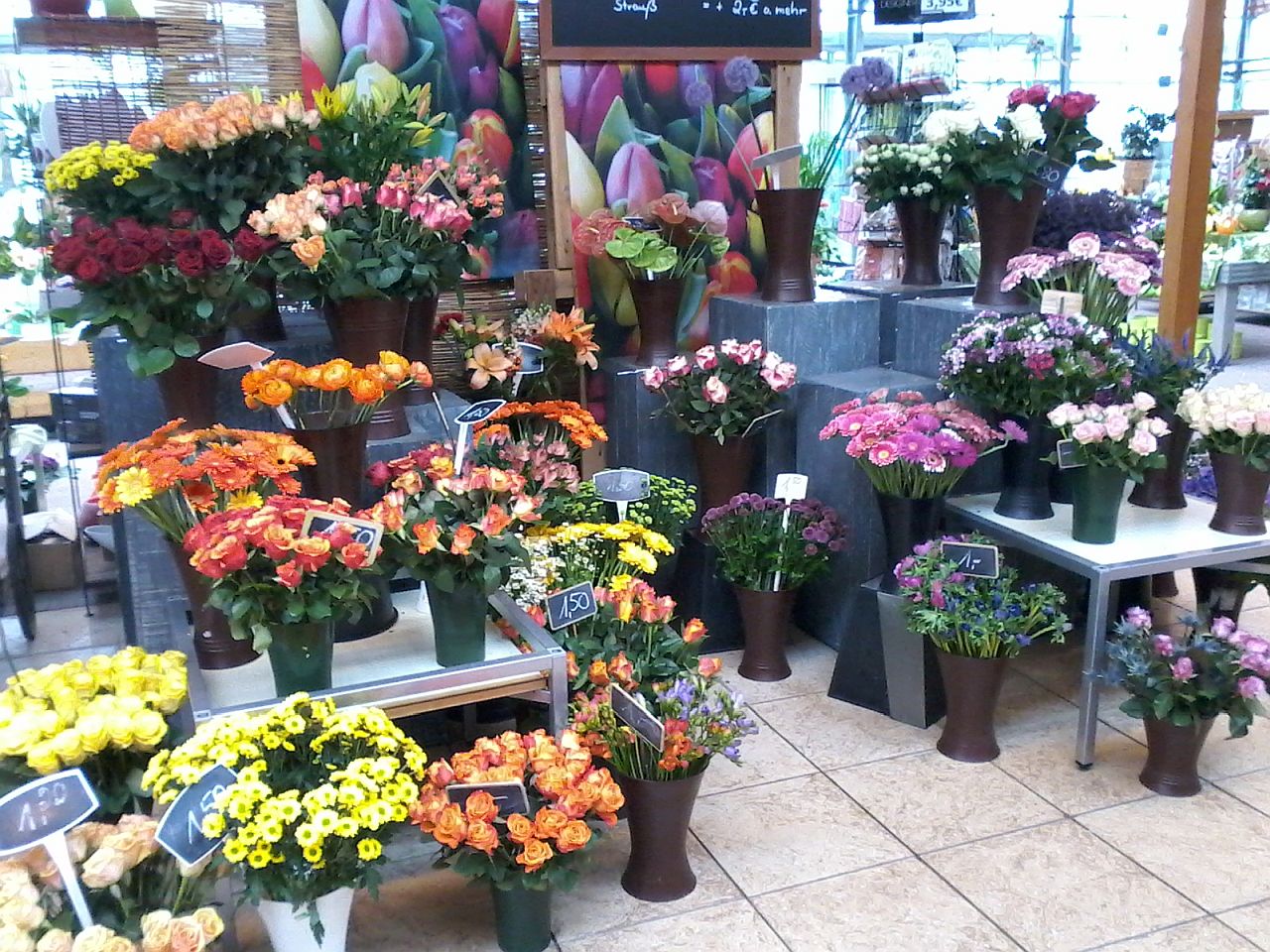 Tulpen stehen hoch im Kurs, aber auch intensiv duftende Hyazinthen, Narzissen, Ranunkeln, Fresien u.v.m. warten auf ihre Verarbeitung zu schönen Sträußen.