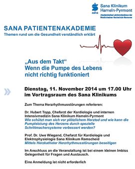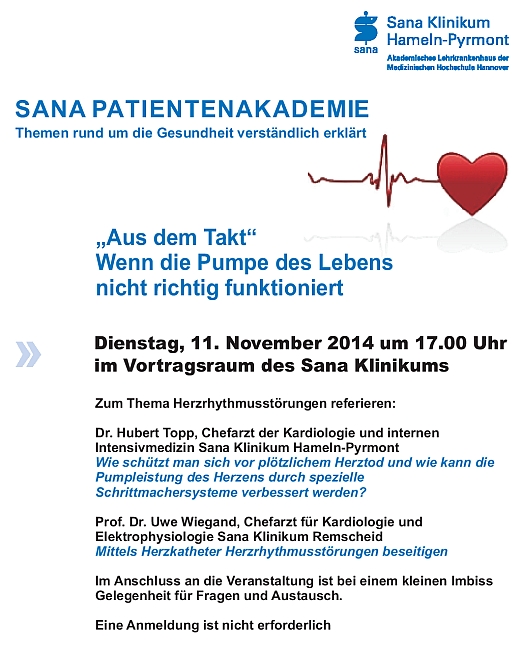 Hameln, 10.11.2014. Viele Menschen sind von Herzrhythmusstörungen betroffen. Für sie besteht häufig Unsicherheit darüber, ob diese harmlos oder gefährlich sind und wie sie behandelt werden können. Allein die Zahl der von Vorhofflimmern Betroffenen in Deutschland, der häufigsten Form der Herzrhythmusstörung, wurde auf etwa eine Million geschätzt. Dr. Hubert Topp, Chefarzt am Sana Klinikum Hameln und Prof. Dr. Uwe Wiegand, Chefarzt für Kardiologie und Elektrophysiologie am Sana Klinikum Remscheid referieren zum Thema Herzrhythmusstörungen am 11. November um 17.00 Uhr im Vortragssaal des Sana Klinikums Hameln-Pyrmont.