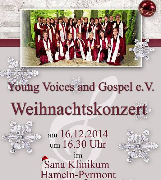 Der Gospelchor „Young Voices & Gopsel“ wird am 16.12.2014 ab 16.30 Uhr die Eingangshalle des Sana Klinikums mit weihnachtlichen Klängen auf gospelweise verzaubern.